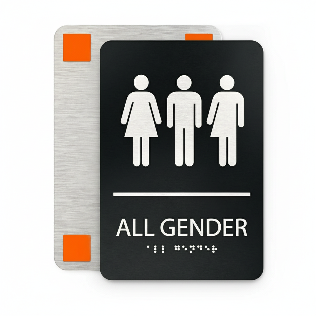 ADA compliant all gender bathroom sign made of composite aluminum, featuring raised symbols and Braille for accessible restrooms.