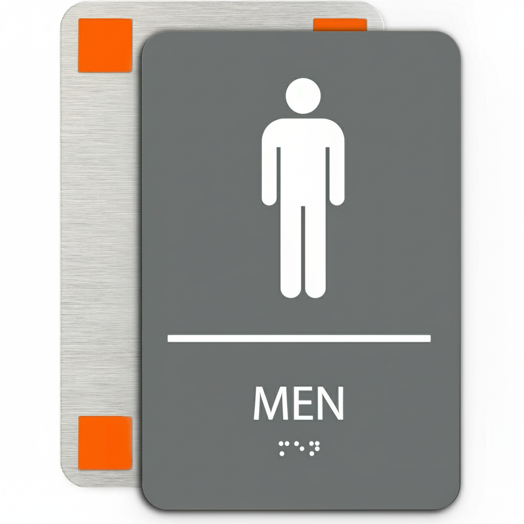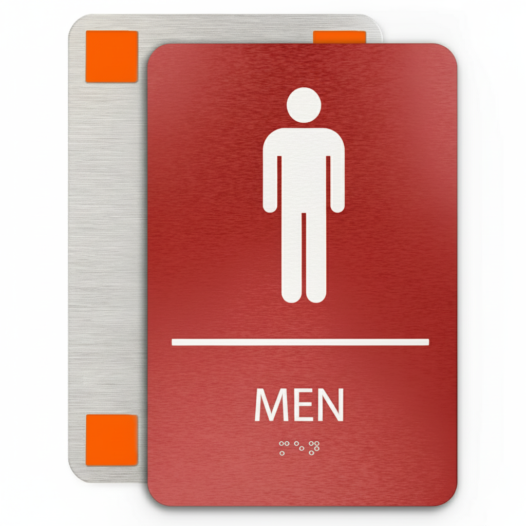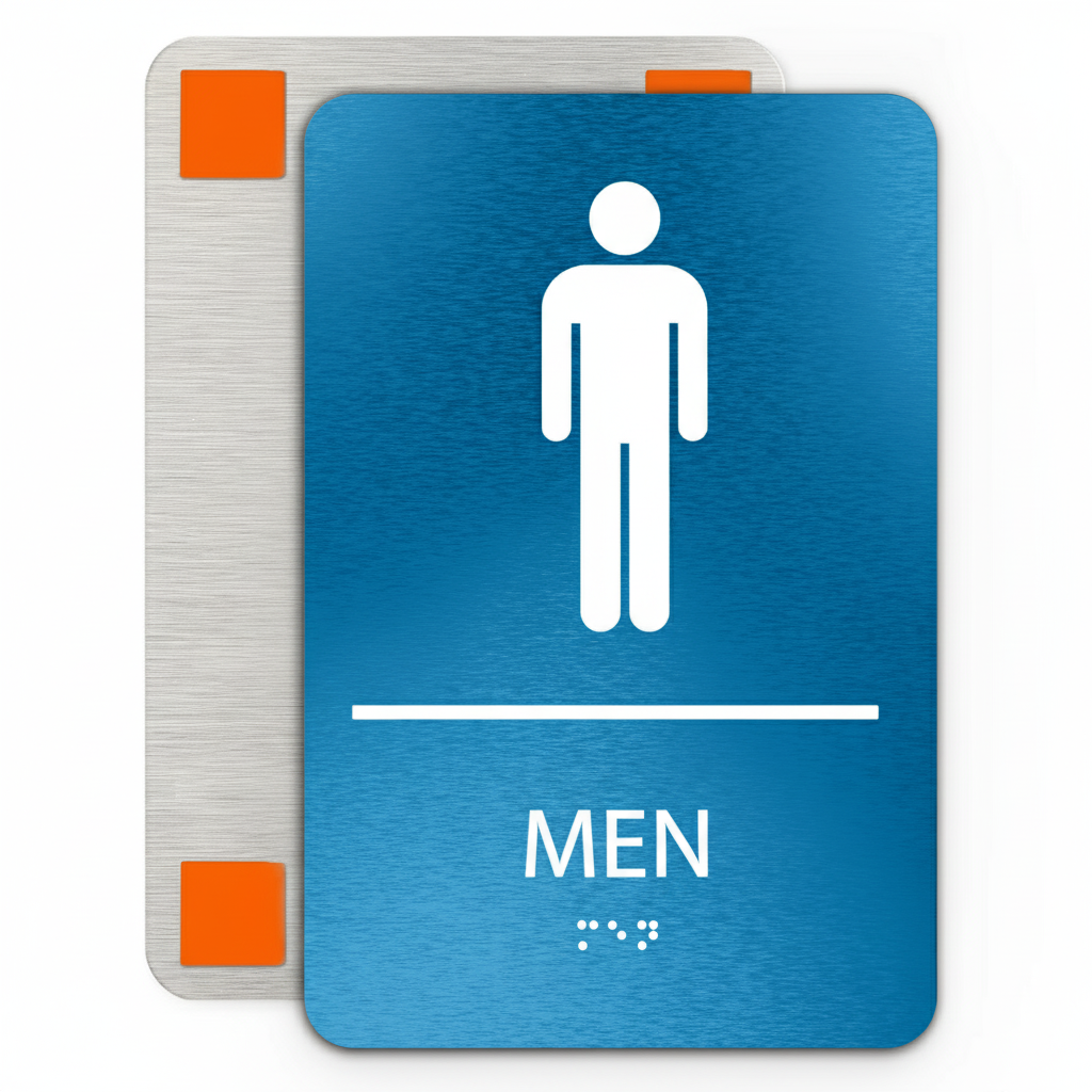Modern and highly durable men restroom sign fabricated from aluminum composite material (ACM) painted in multiple color options—including blue, red, gray, white, and black—engineered for dimensional stability and long-term performance. The sign features precision-molded raised pictograms for male and accessibility, as well as Grade 2 Braille, fully compliant with ADA accessibility standards.