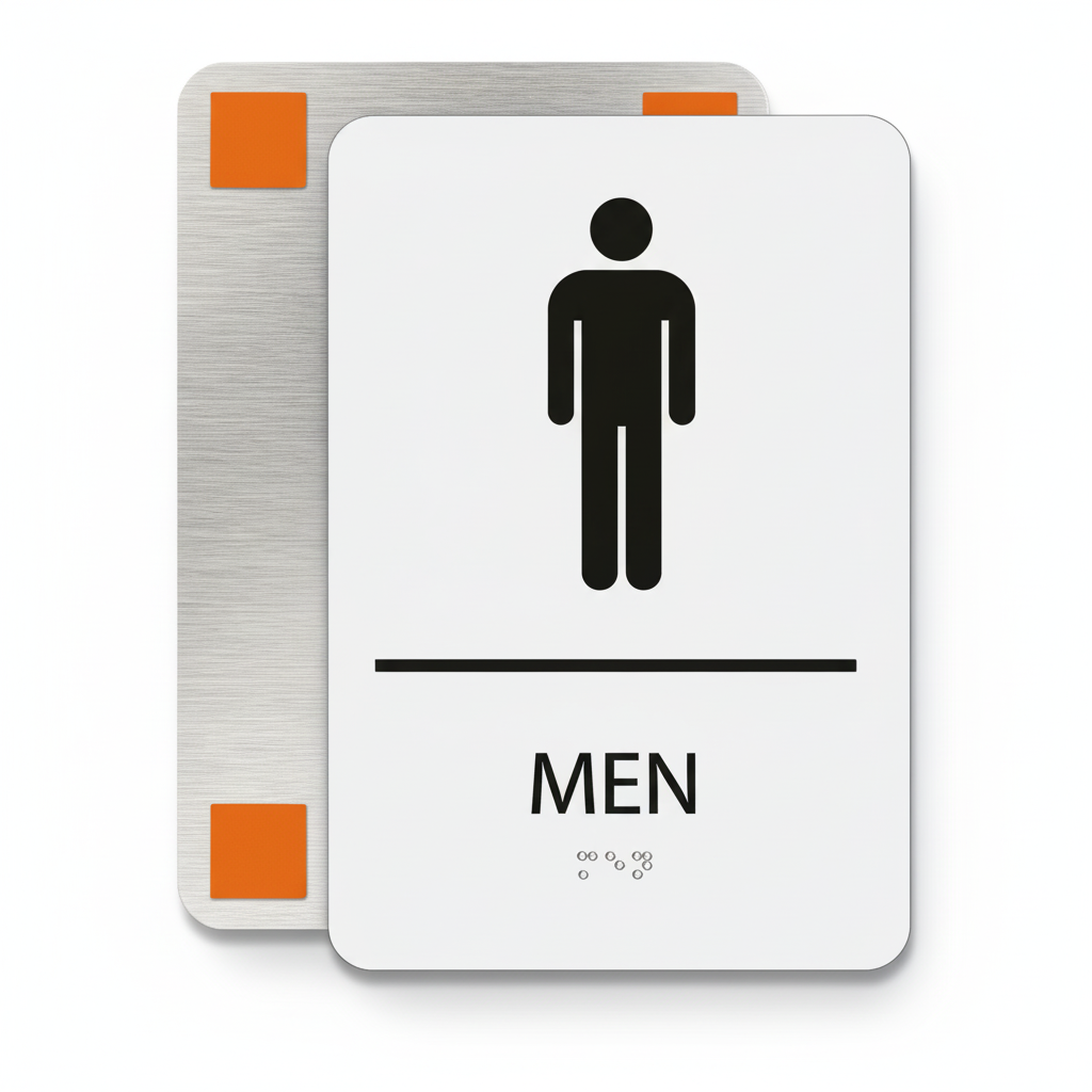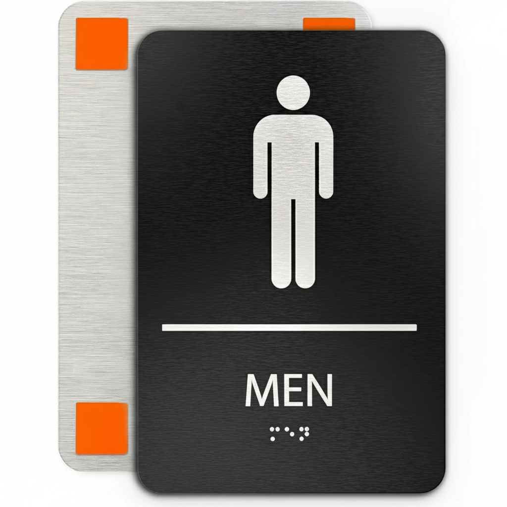 ADA compliant men bathroom sign made of composite aluminum, featuring raised symbols and Braille for accessible restrooms.